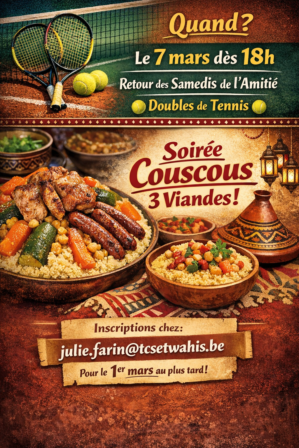 🎾 Matches start at 6:00 PM, fun guaranteed until around 8:30 PM! 🍽️ After the effort comes the comfort!